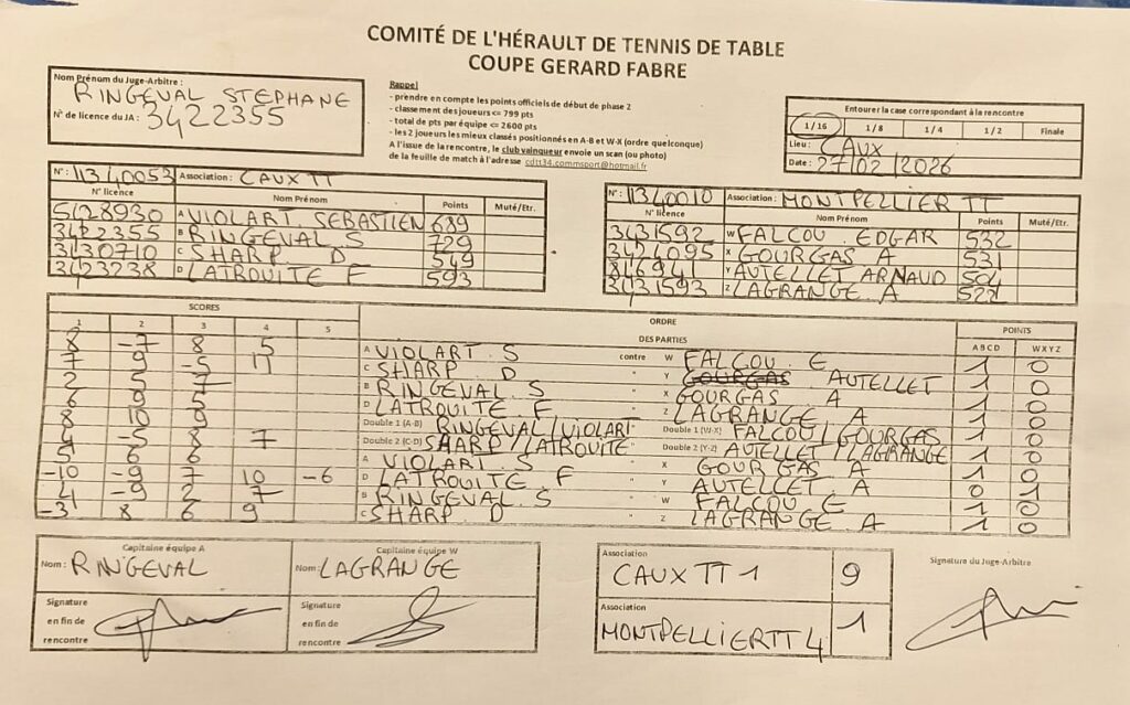 🏆 Coupe Gérard Fabre (vendredi 27/02) : CauxTT1 vs Montpellier TT4 (victoire 9–1) ✅🔥