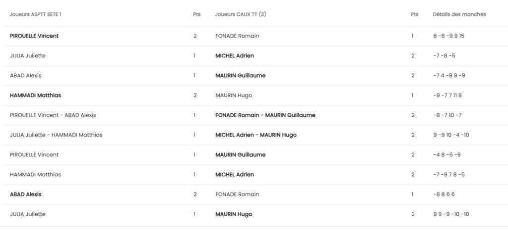 - mardi 24/02, une rencontre de Coupe Lecler à Sète pour CauxTT3
