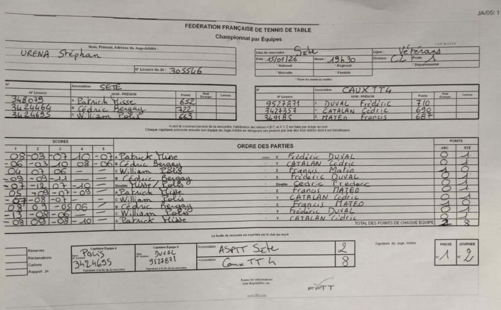 🚌 Match 2 – Jeudi 15/01 à Sète : ASPTT Sète vs CauxTT | Victoire 8–2 ✅