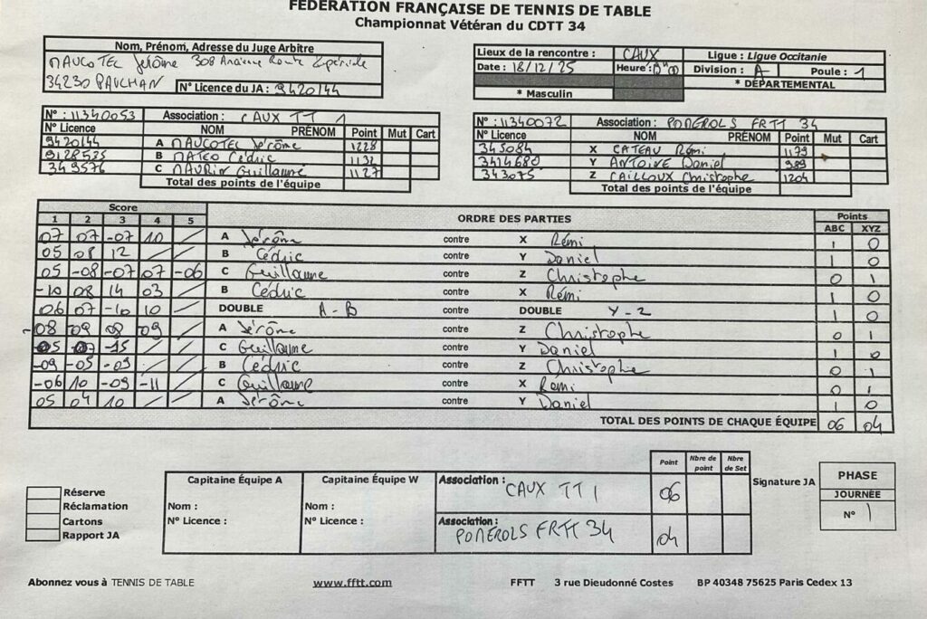 📌 Score final : CauxTT1 6–4 Pomerols FRTT 1